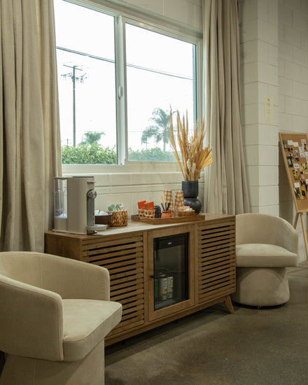 - Lounge Area Details: Features a cream limewash wall, stylish furniture, a large mirror, privacy curtains, and rollup access for natural lighting and dramatic shadows